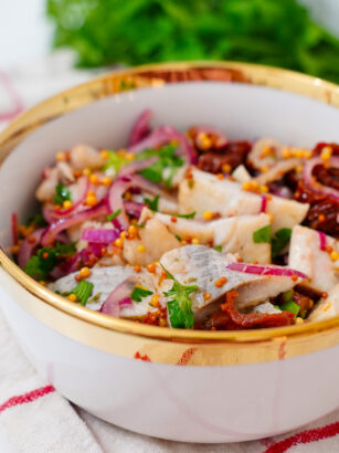 Śledzie z marchewką i rodzynkami to idealna propozycja na pyszną sałatkę śledziową. To bardzo ciekawe połączenie smakowe, które z pewnością posmakuje nie jednemu z Was.